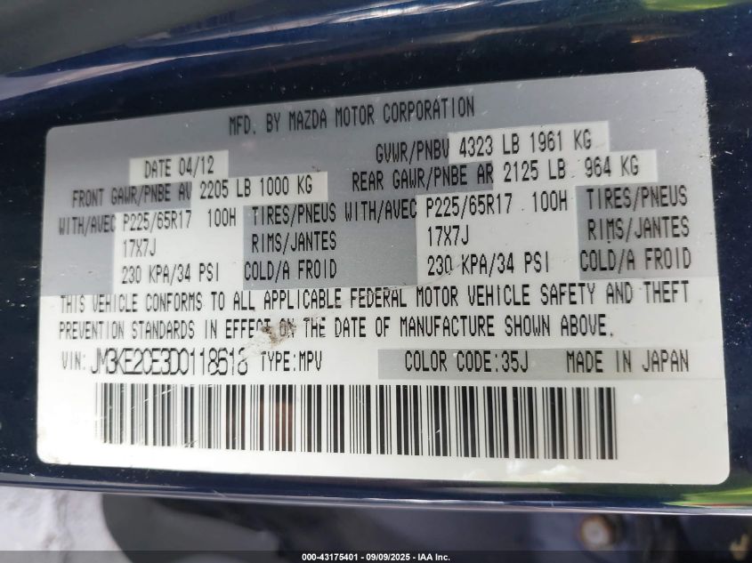 Колір СинійЦиліндри 4Привід Передній привідVIN JM3KE2CE3D0******Стан НевідомоУшкодження Передня або задняДата аукціону 2025-09-23
