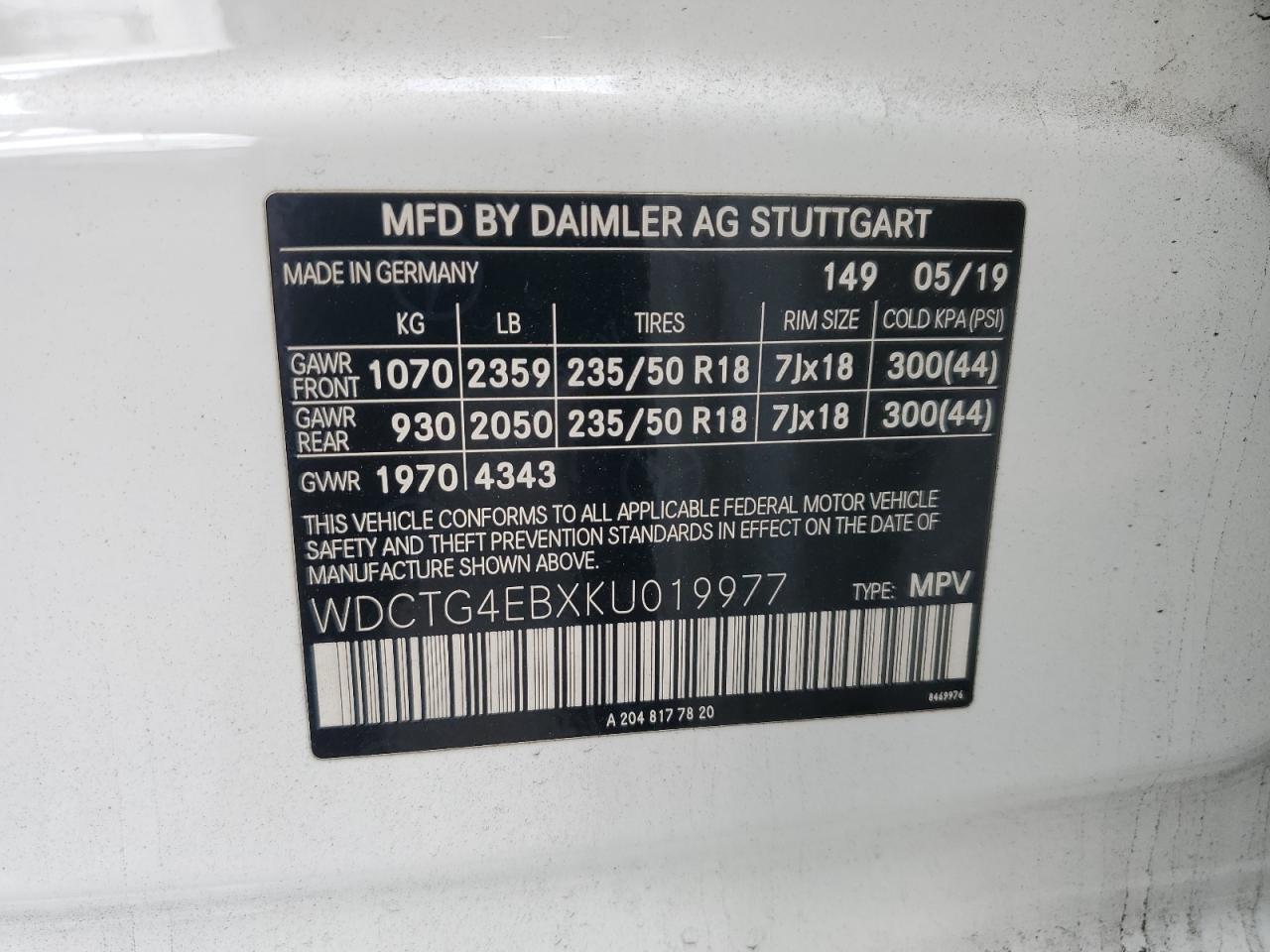 Колір БілийЦиліндри 4VIN WDCTG4EBXKU019977Стан НевідомоУшкодження Передня або задняДата аукціону 2025-12-05 AutoRIA