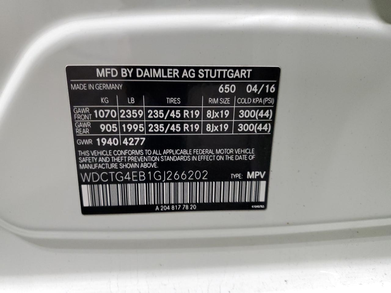 Колір БілийЦиліндри 4VIN WDCTG4EB1GJ266202Стан Заводиться та їде (перевірено)Ушкодження Передня або задняДата аукціону 2025-12-08 AutoRIA