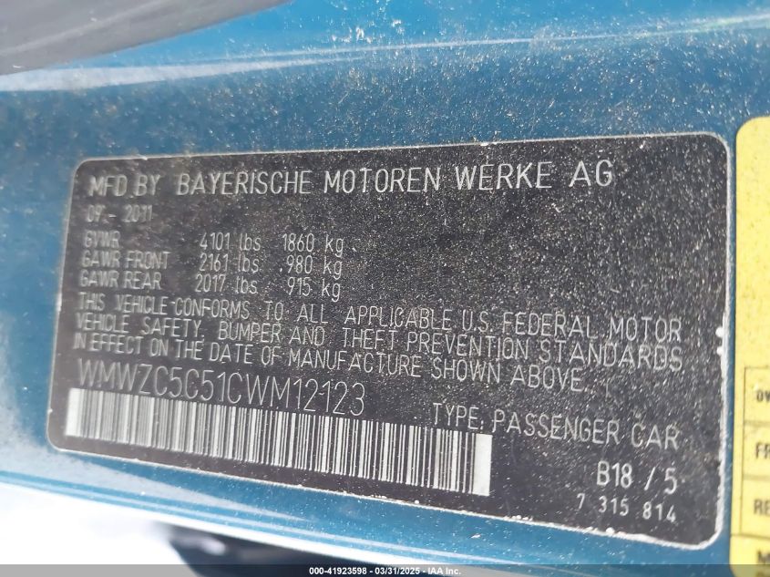 Колір СинійЦиліндри 4Привід Повний привідVIN WMWZC5C51CW******Стан НевідомоУшкодження Передня праваДата аукціону 2025-08-19