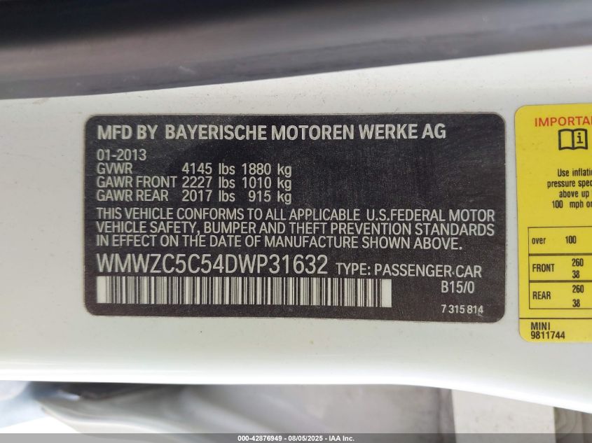 Колір БілийЦиліндри 4Привід Повний привідVIN WMWZC5C54DW******Стан НевідомоУшкодження ЕлектрикаДата аукціону 2025-09-03