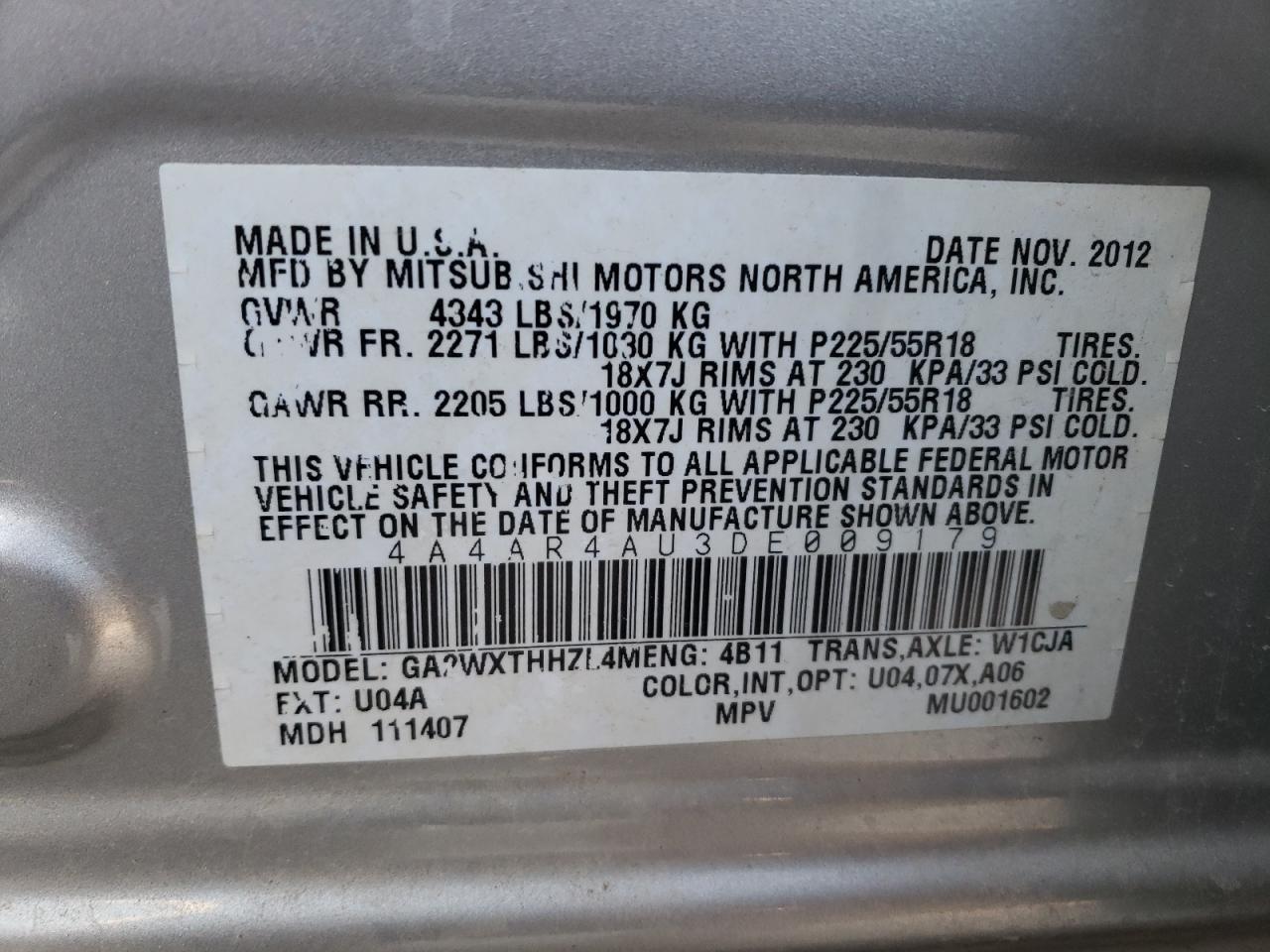 Колір СрібнийЦиліндри 4Привід Повний привідVIN 4A4AR4AU3DE009179Стан Заводиться та їде (перевірено)Ушкодження Передня або задняДата аукціону 2025-06-18