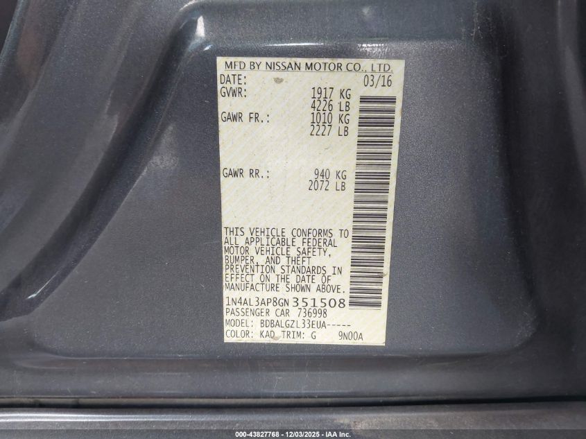 2016 NISSAN ALTIMA 2016 року Бензин, 2.5, Передній привід, vin - 1N4AL3AP8GN351508 з США