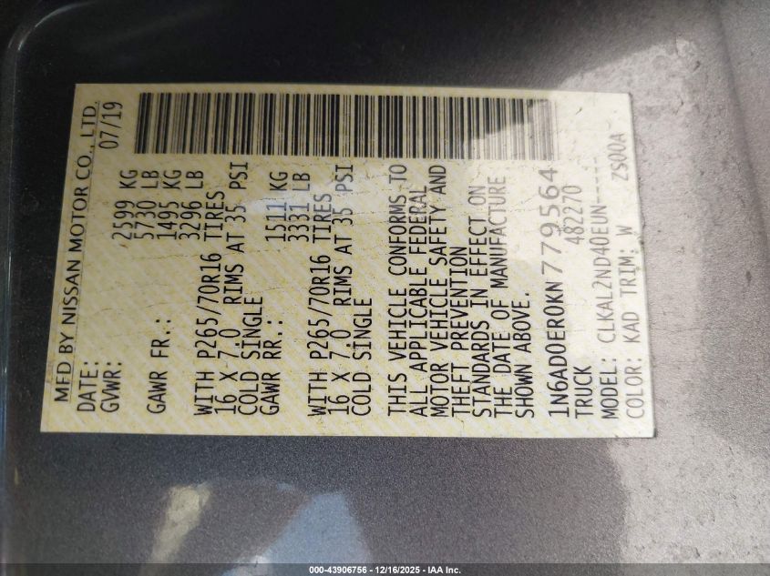 2019 NISSAN FRONTIER 2019 року Бензин, 4.0, , vin - 1N6AD0ER0KN779564 з США