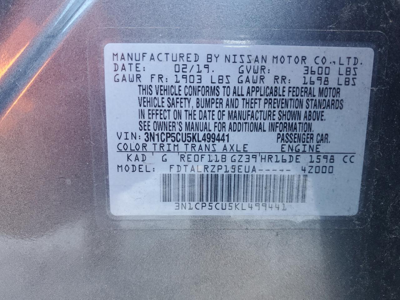 2019 NISSAN KICKS 2019 року Бензин, 1.6, , vin - 3N1CP5CU5KL499441 з США