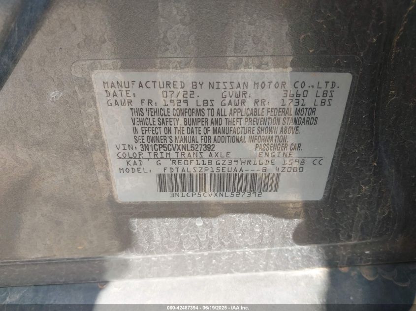 2022 NISSAN KICKS 2022 року Бензин, 1.6, Передній привід, vin - 3N1CP5CVXNL****** з США