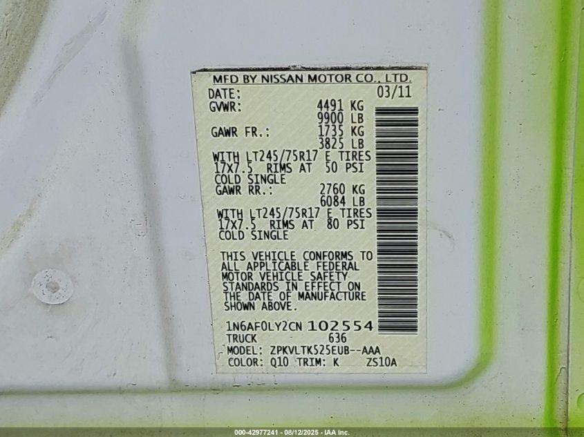 2012 NISSAN NV3500 2012 року Бензин, 5.6, Задній привід, vin - 1N6AF0LY2CN102554 з США