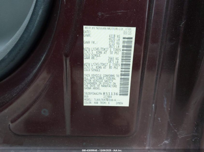 2015 NISSAN NV3500 2015 року Бензин, 4.0, Задній привід, vin - 5BZBF0AA1FN851136 з США