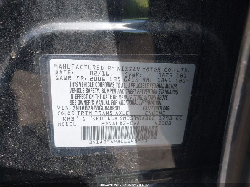 2016 NISSAN SENTRA 2016 року Бензин, 1.8, Передній привід, vin - 3N1AB7AP8GL****** з США