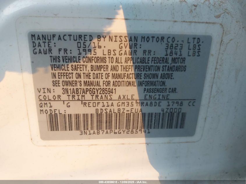 2016 NISSAN SENTRA 2016 року Бензин, 1.8, Передній привід, vin - 3N1AB7AP6GY285941 з США