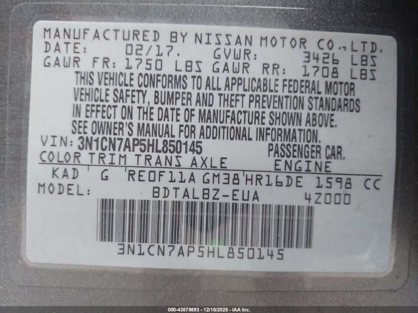 2017 NISSAN VERSA S