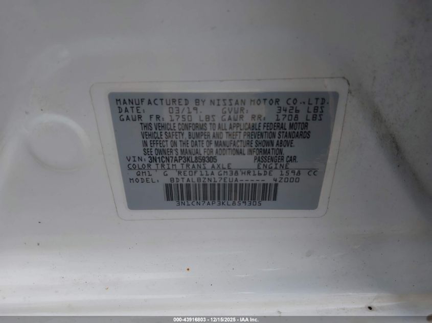 2019 NISSAN VERSA 2019 року Бензин, 1.6, Передній привід, vin - 3N1CN7AP3KL859305 з США