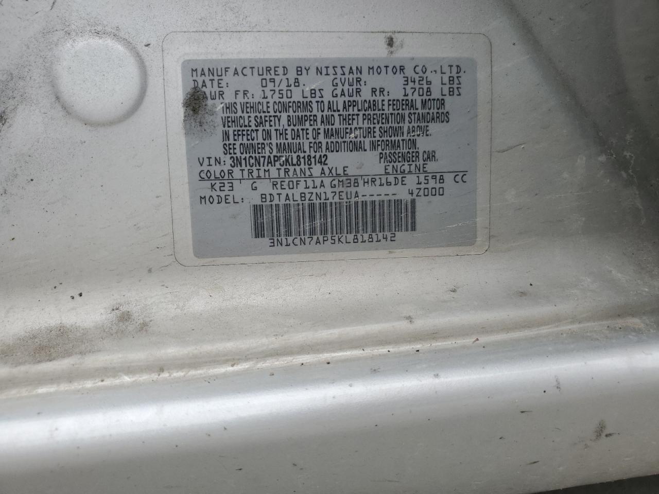 Колір СрібнийЦиліндри 4VIN 3N1CN7AP5KL818142Стан Заводиться та їде (перевірено)Ушкодження ЗадняДата аукціону 2025-12-05 AutoRIA