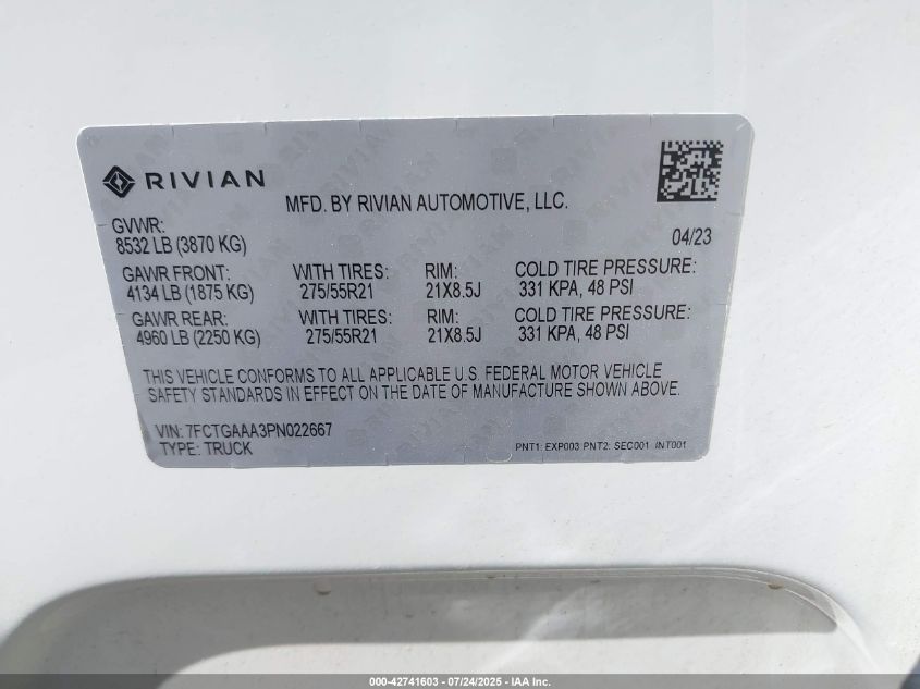 2023 RIVIAN R1T 2023 року Електричний, 0.0, Повний привід, vin - 7FCTGAAA3PN****** з США
