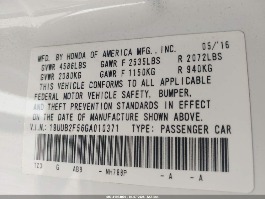 Цвет БелыйЦилиндры 6Привод Передний приводVIN 19UUB2F56GA******Состояние НеизвестноПовреждения ГрадДата аукциона 2025-07-09