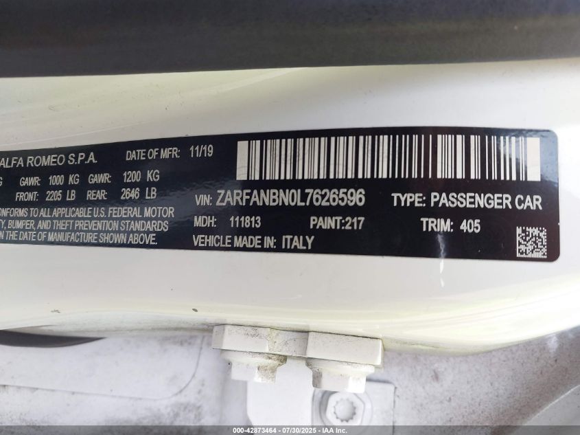 2020 ALFA ROMEO GIULIA 2020 року Бензин, 2.0, Полный привод, vin - ZARFANBN0L7****** из США