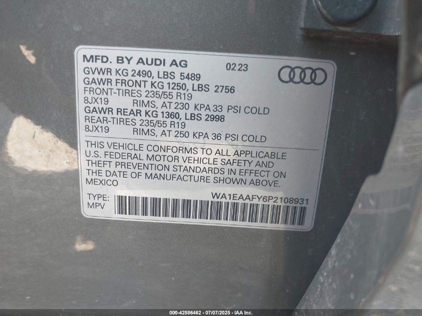 Цвет СерыйЦилиндры 4Привод Полный приводVIN WA1EAAFY6P2108931Состояние СтационарноПовреждения Передняя или задняяДата аукциона 2025-10-16