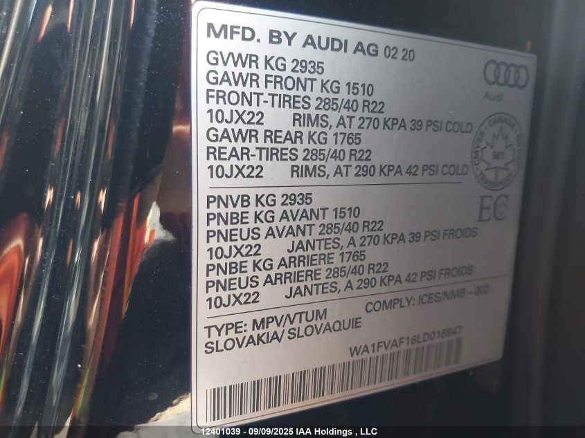 2020 AUDI Q8 2020 року Бензин, , Полный привод, vin - WA1FVAF16LD018947 из США