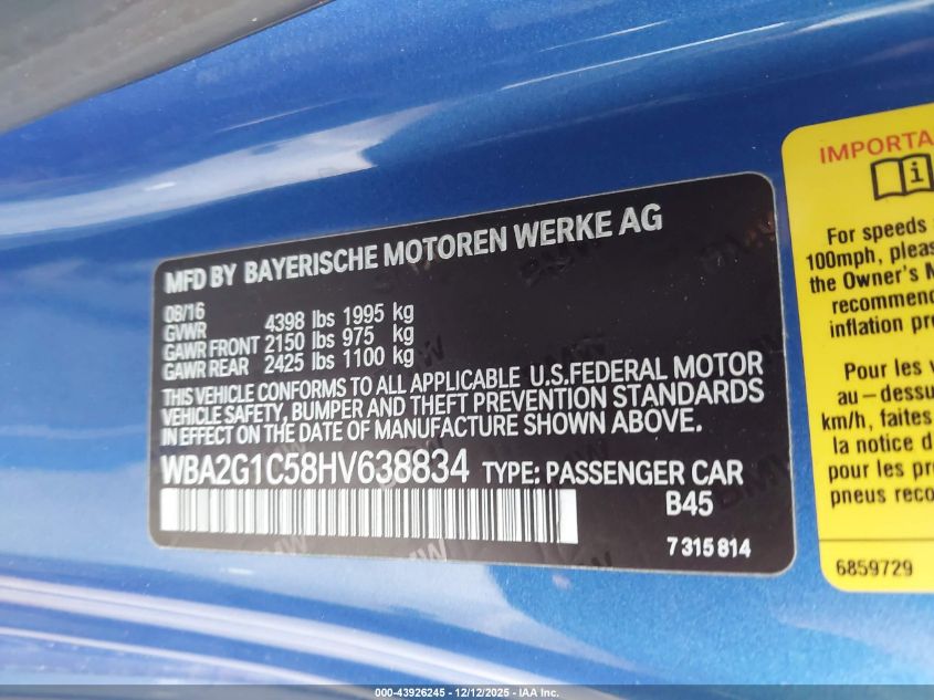 Цвет СинийЦилиндры 6Привод Задний приводVIN WBA2G1C58HV638834Состояние Заводится и едет (проверено)Повреждения Передняя или задняя AutoRIA