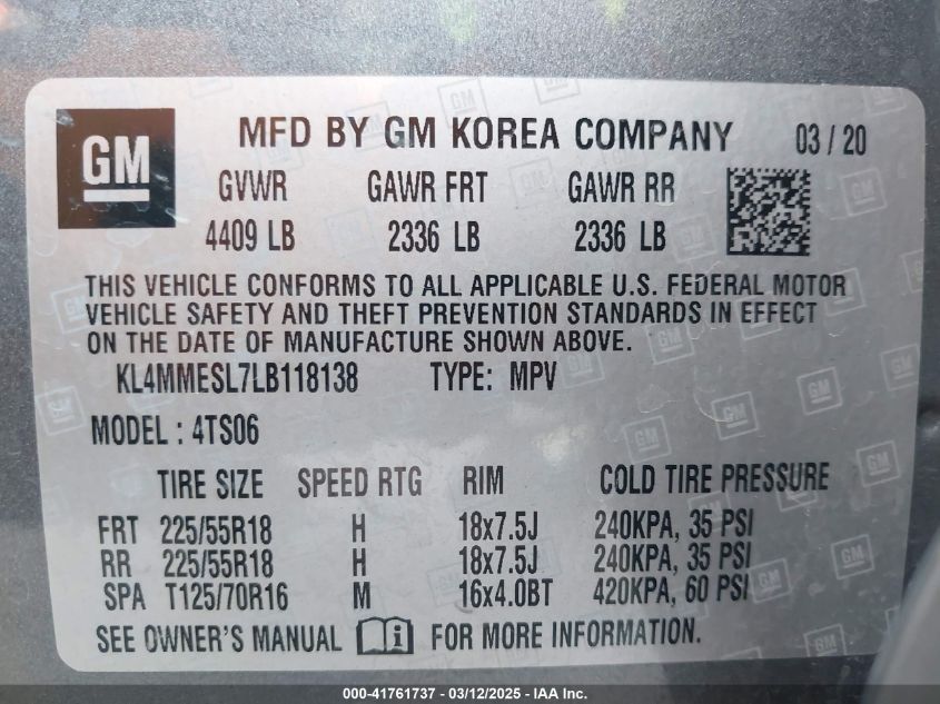 2020 BUICK ENCORE GX 2020 року Бензин, 1.3, Полный привод, vin - KL4MMESL7LB****** из США