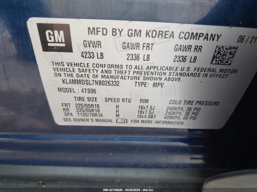Цвет СинийЦилиндры 3Привод Передний приводVIN KL4MMDSL7NB******Состояние НеизвестноПовреждения Правая сторонаДата аукциона 2025-06-10