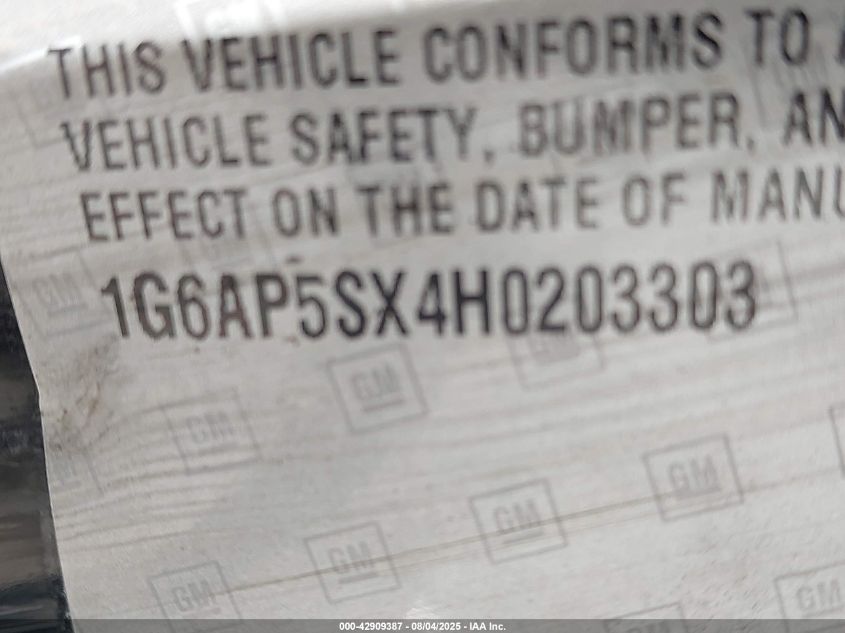 Цвет ЧерныйЦилиндры 4Привод Задний приводVIN 1G6AP5SX4H0******Состояние НеизвестноПовреждения Передняя или задняяДата аукциона 2025-09-04