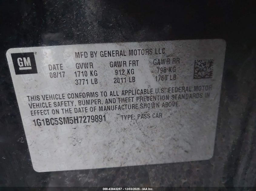 2017 CHEVROLET CRUZE 2017 року Бензин, 1.4, Передний привод, vin - 1G1BC5SM5H7279891 из США