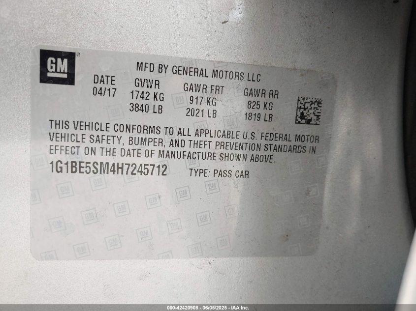 Цвет СеребряныйЦилиндры 4Привод Передний приводVIN 1G1BE5SM4H7******Состояние НеизвестноПовреждения Пожар двигателяДата аукциона 2025-06-30