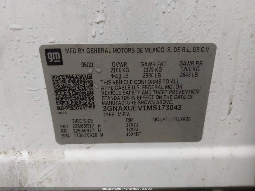 2021 CHEVROLET EQUINOX 2021 року Бензин, 1.5, Полный привод, vin - 3GNAXUEV1MS173043 из США