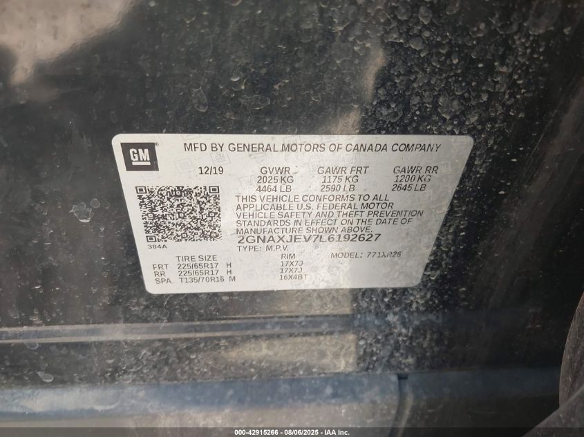 2020 CHEVROLET EQUINOX 2020 року Бензин, 1.5, Передний привод, vin - 2GNAXJEV7L6192627 из США