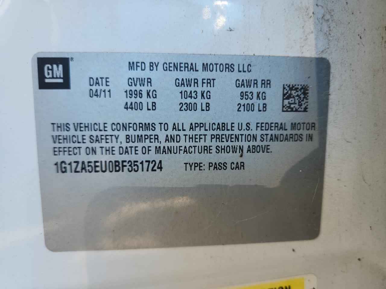 Цвет БелыйЦилиндры 4VIN 1G1ZA5EU0BF351724Состояние Заводится и едет (проверено)Повреждения ГрадДата аукциона 2025-12-08