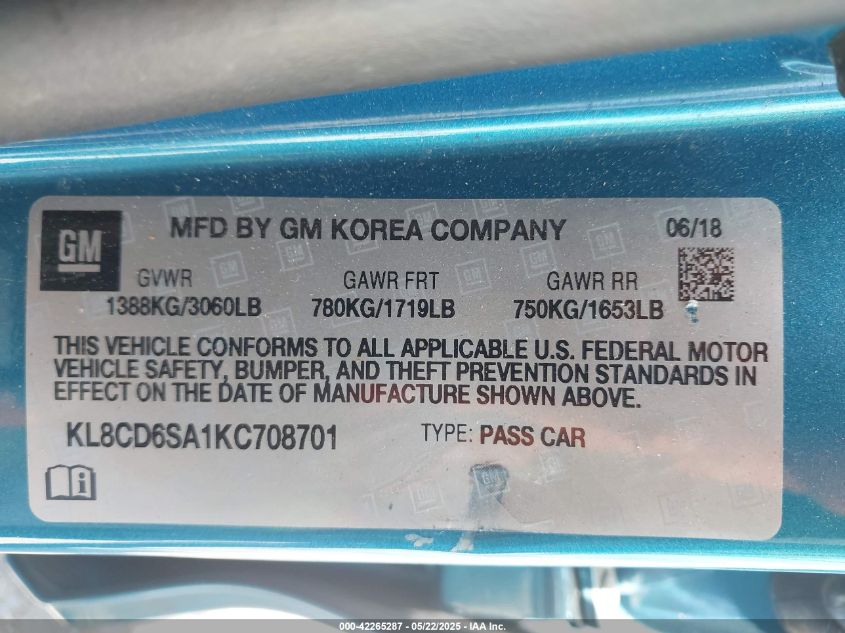 2019 CHEVROLET SPARK 2019 року Бензин, 1.4, Передний привод, vin - KL8CD6SA1KC****** из США