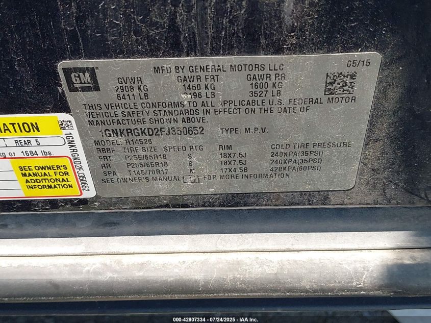 Цвет СинийЦилиндры 6Привод Передний приводVIN 1GNKRGKD2FJ******Состояние НеизвестноПовреждения Передняя или задняяДата аукциона 2025-08-25