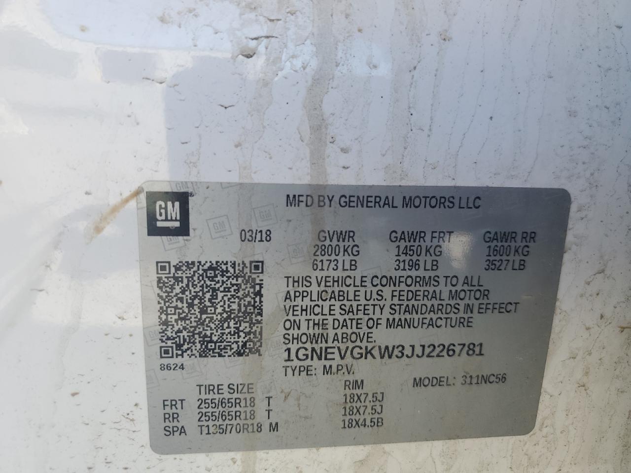 2018 CHEVROLET TRAVERSE 2018 року Бензин, 3.6, Полный привод, vin - 1GNEVGKW3JJ226781 из США