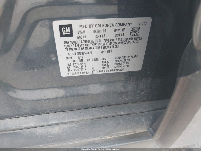 Цвет СинийЦилиндры 4Привод Передний приводVIN KL7CJLSM6NB568077Состояние СтационарноПовреждения Передняя и задняяДата аукциона 2025-11-05