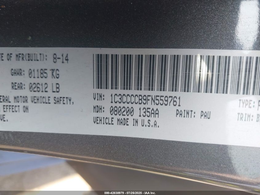 Цвет СерыйЦилиндры 4Привод Передний приводVIN 1C3CCCCB9FN******Состояние НеизвестноПовреждения Правая сторонаДата аукциона 2025-09-24