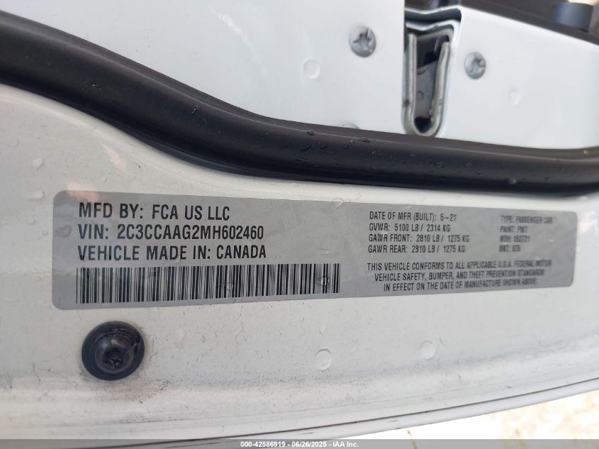 Цвет БелыйЦилиндры 6Привод Задний приводVIN 2C3CCAAG2MH******Состояние НеизвестноПовреждения Передняя или задняяДата аукциона 2025-08-27