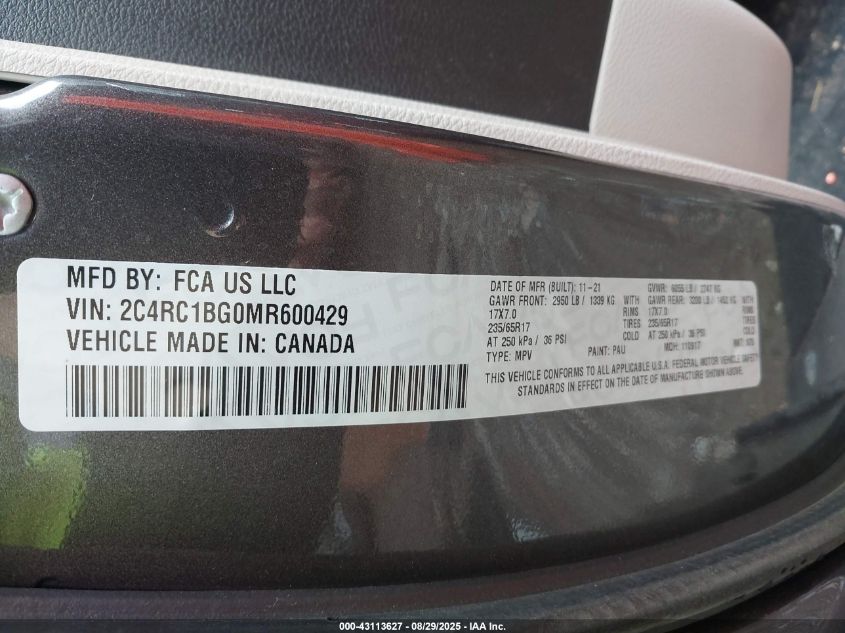 2021 CHRYSLER PACIFICA 2021 року Бензин, 3.6, Передний привод, vin - 2C4RC1BG0MR600429 из США