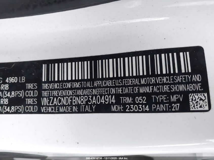 Цвет БелыйЦилиндры 4Привод Полный приводVIN ZACNDFBN8P3A04914Состояние Заводится и едет (проверено)Повреждения Передняя левая AutoRIA