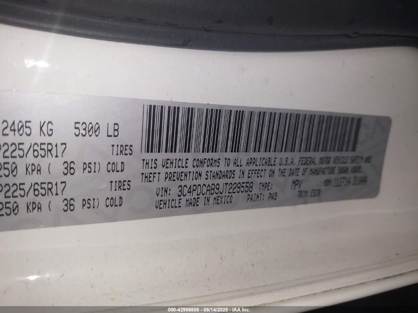 Цвет БелыйЦилиндры 4Привод Передний приводVIN 3C4PDCAB9JT229558Состояние СтационарноПовреждения Передняя или задняяДата аукциона 2025-10-09