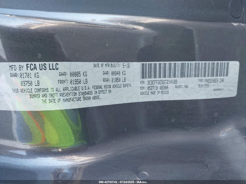 Цвет СерыйПривод Передний приводVIN 3C3CFFGE5GT******Состояние НеизвестноПовреждения Передняя или задняяДата аукциона 2025-09-03