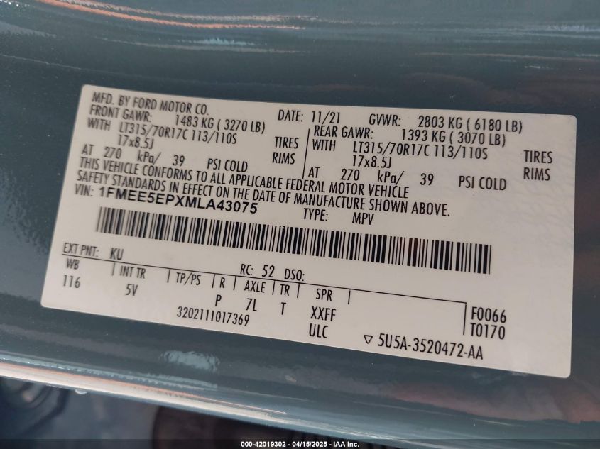 Цвет СинийЦилиндры 6Привод Полный приводVIN 1FMEE5EPXML******Состояние НеизвестноПовреждения Передняя леваяДата аукциона 2025-06-18