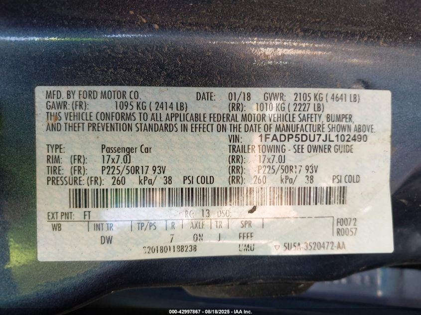 Цвет СинийЦилиндры 4Привод Передний приводVIN 1FADP5DU7JL102490Состояние Заводится и едет (проверено)Повреждения Передняя или задняяДата аукциона 2025-10-27
