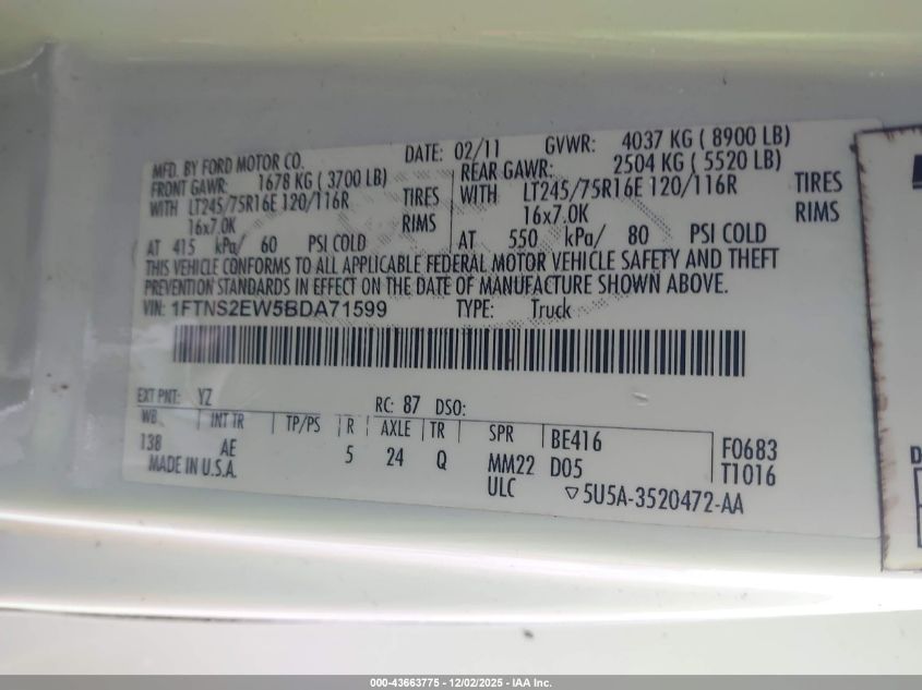 Цвет БелыйЦилиндры 8Привод Задний приводVIN 1FTNS2EW5BDA71599Состояние СтационарноПовреждения Обычный износ