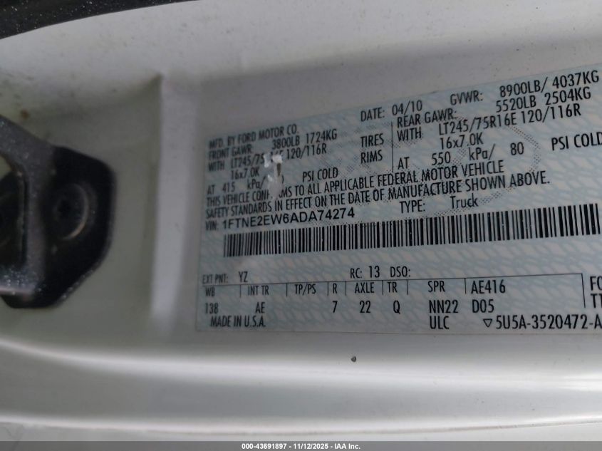 Цвет БелыйЦилиндры 8Привод Задний приводVIN 1FTNE2EW6ADA74274Состояние Заводится и едет (проверено)Повреждения Передняя и задняяДата аукциона 2025-12-09