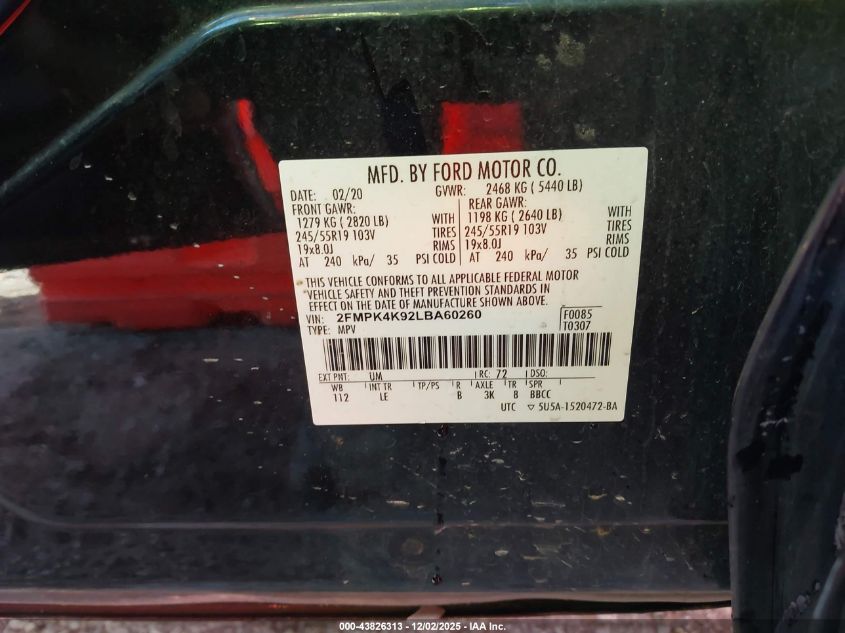 2020 FORD EDGE 2020 року Бензин, 2.0, Полный привод, vin - 2FMPK4K92LBA60260 из США