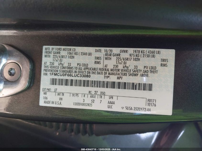 2020 FORD ESCAPE 2020 року Бензин, 1.5, Передний привод, vin - 1FMCU0F66LUC33080 из США