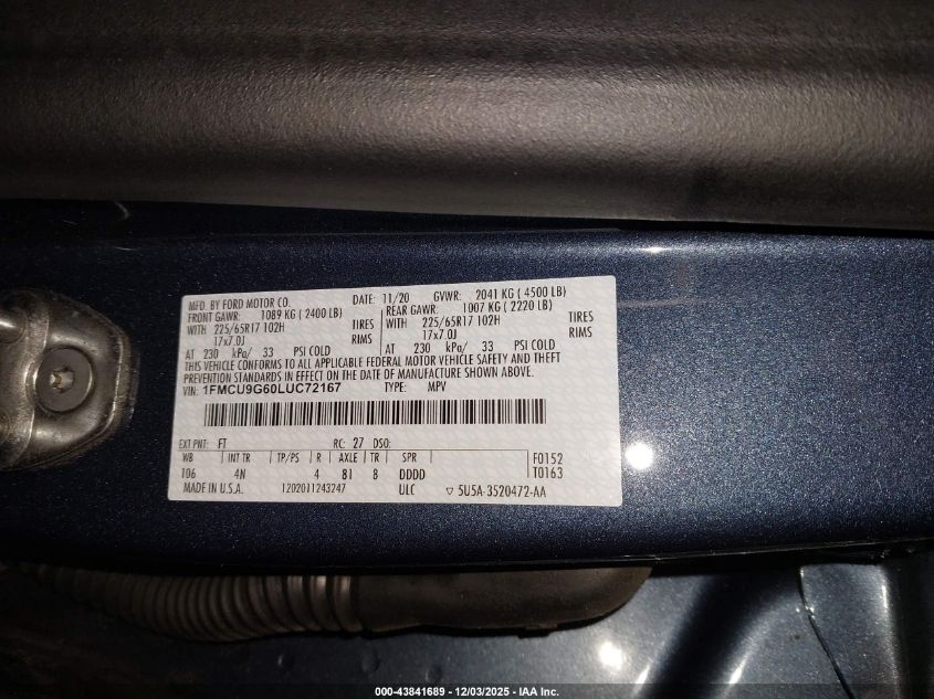 2020 FORD ESCAPE 2020 року Бензин, 1.5, Полный привод, vin - 1FMCU9G60LUC72167 из США