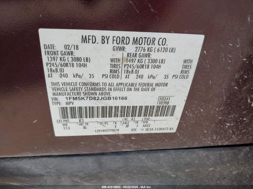 Цвет БордовыйЦилиндры 6Привод Передний приводVIN 1FM5K7D82JG******Состояние НеизвестноПовреждения Передняя праваяДата аукциона 2025-08-13