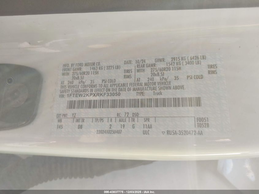 Цвет БелыйЦилиндры 6VIN 1FTEW2KPXRKF33050Состояние Заводится и едет (проверено)Повреждения Передняя или задняяДата аукциона 2025-12-11 AutoRIA